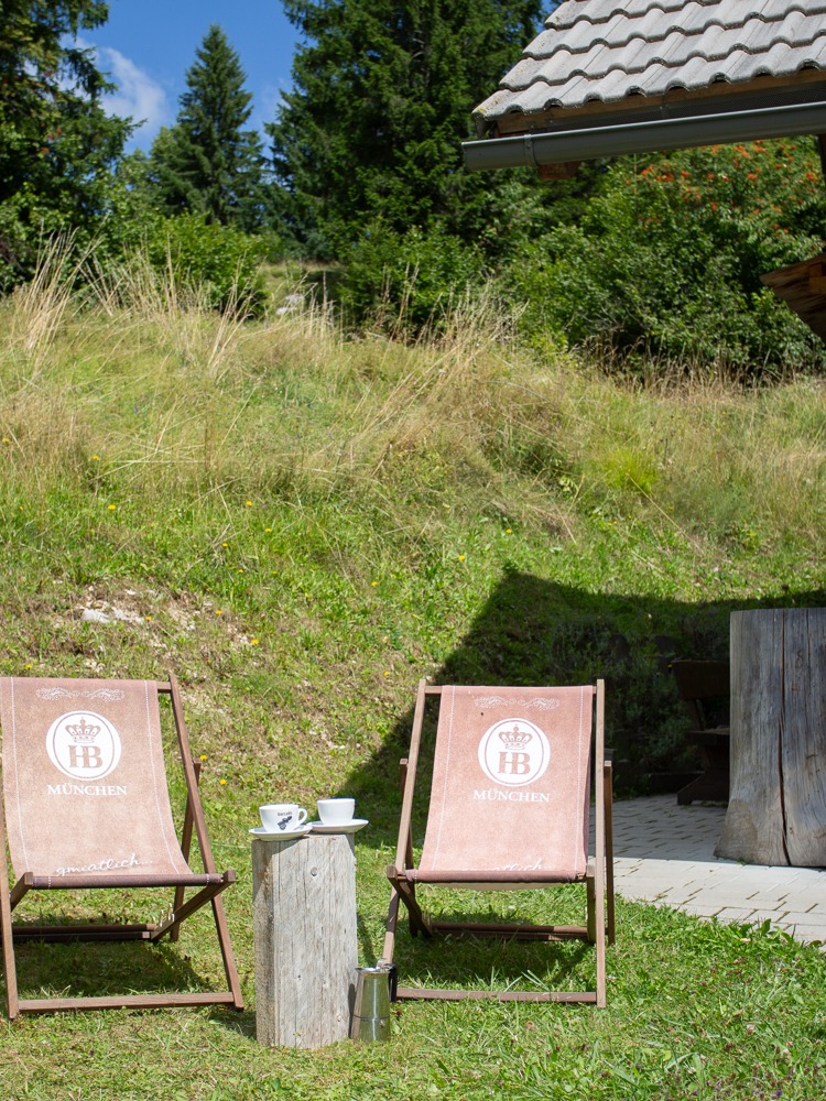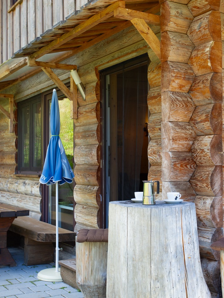 Wohnraum mit Sofa, Holzofen & SAT-TV
